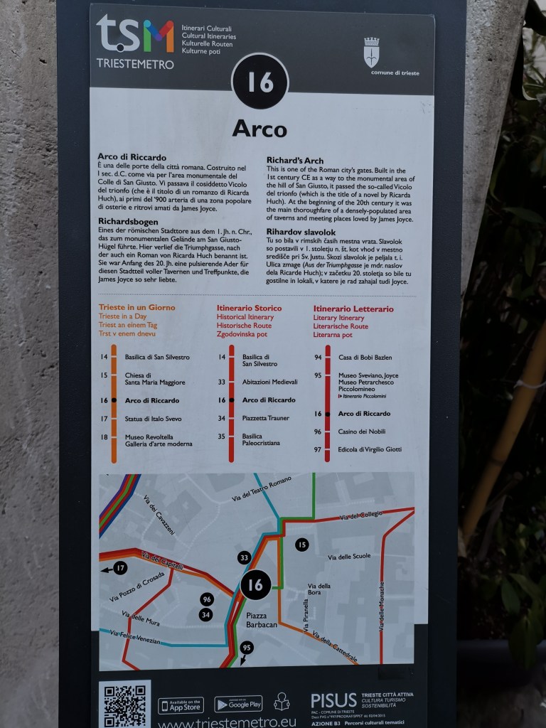 Was ich richtig toll in Triest finde: In der Altstadt verteilt stehen Schilder mit kostenlosen Infos zur Stadt(geschichte), so auch hier beim Arco di Riccardo. So erfährt man während des Stadtrundgangs viel Wissenswertes über die Stadt und ihre Geschichte.