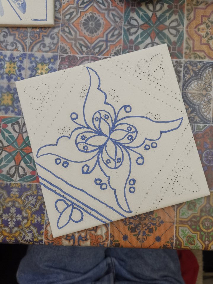 Zu Beginn des Workshops gibt Caroline eine kurze Einführung zur Geschichte und Kunst der Azulejos. Anschließend erklärt sie die Technik der Fliesenmalerei und was es dabei zu beachten gilt. Ehe es richtig losgeht, bekommt jeder noch eine „Probefliese“, um ein Gefühl für die Malerei auf der Kachel zu bekommen und es „gefahrenlos“ ausprobieren zu können. Erst dann wählt man eines der am Tisch liegenden Motive aus und bekommt eine weiße Kachel mit bereits vorgezeichneter Schablone zum Nachzeichnen. Spoiler: Es sieht viel einfacher aus als es ist!! Selbst mit den vorgezeichneten Punkten erfordert es wirklich viel Geschick sowie eine sehr ruhige Hand, um gerade Linien zu ziehen. 😀