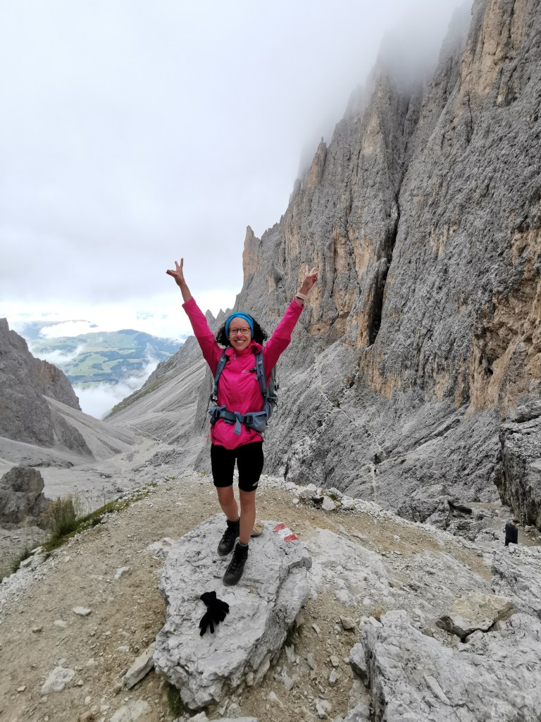 Auch wenn es nicht so ersichtlich ist, aber es war ganz schön kalt in der Langkofelscharte auf etwa 2.685 Metern Höhe und ich hatte mich etwas zu leicht untenrum gekleidet. Daher war’s gleich noch ein bisschen kälter. 😀 Aber wunderschön! Den Blogbeitrag dazu bin ich euch noch schuldig.