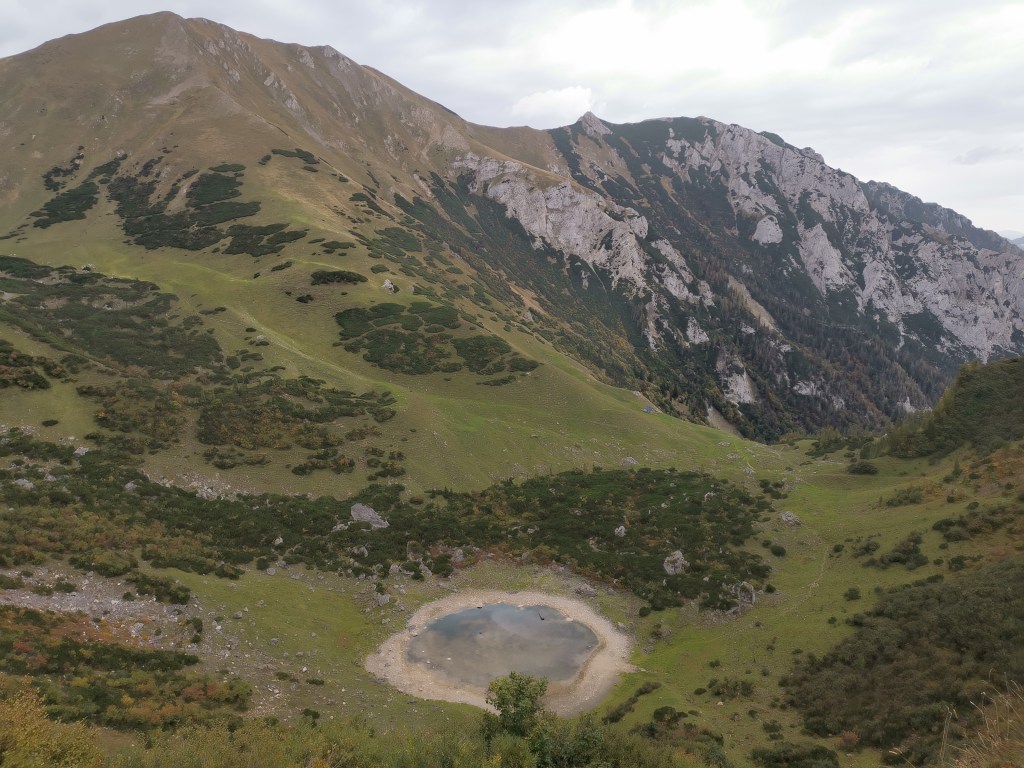 Für den Abstieg wählten wir einen anderen Weg als für den Aufstieg und zwar über die Hirnalm und den Krumpensee nach Vordernberg. In einem Kessel südlich des Reichensteins befindet sich der kleine Krumpensee (1.416 m), wobei es „Latschn“ (= große Pfütze) wohl eher trifft. 😀