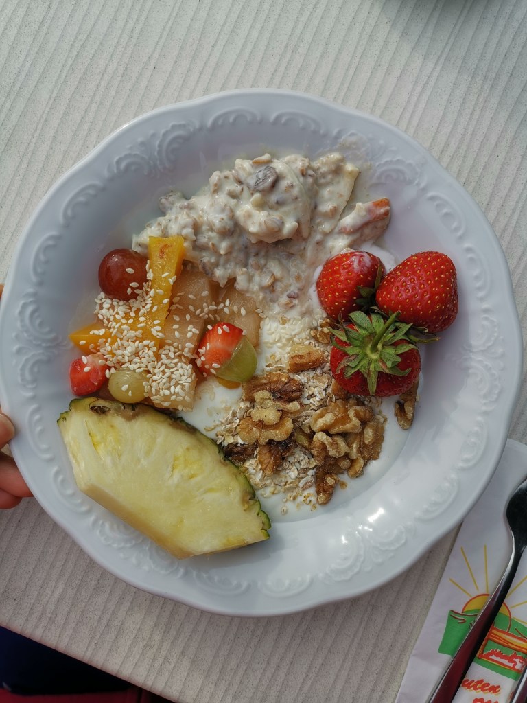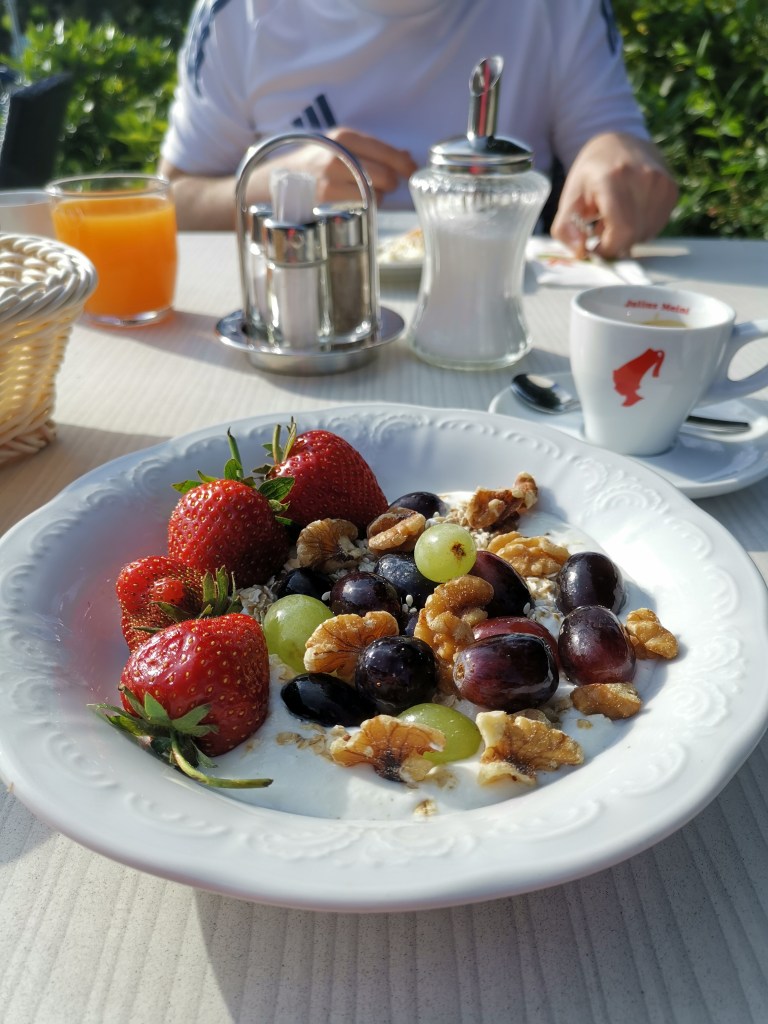 Das Frühstücksbuffet war im Haupthaus (5 Minuten zu Fuß). Wir hatten extremes Glück mit dem Wetter und konnten jeden Tag draußen auf der Terrasse frühstücken – einfach herrlich!