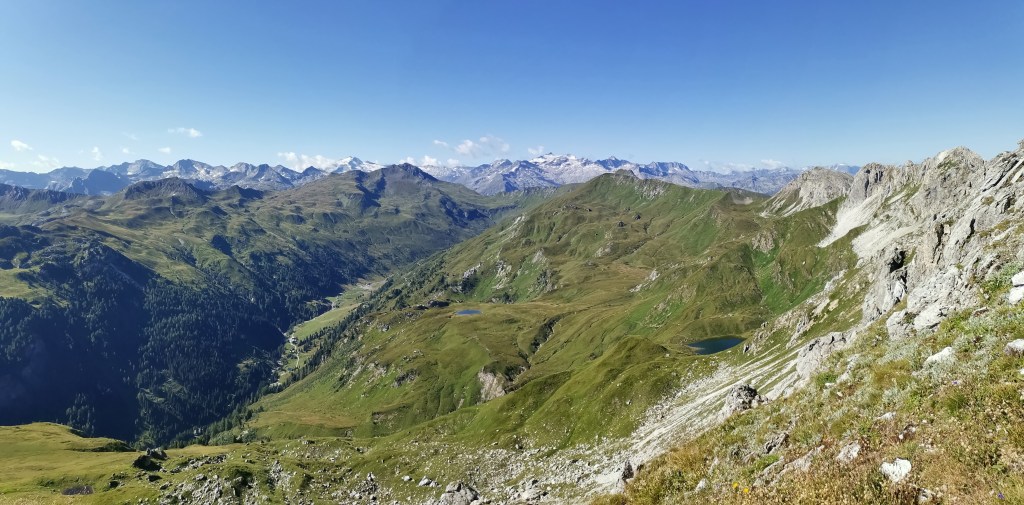 Zwischendurch hat man einen wunderschönen Blick auf die Franz-Fischer-Hütte und oben angekommen einen wunderbaren 360° Panoramablick. Da wir relativ spät gestartet sind (und die meisten wohl eine der längeren Touren geplant hatten), hatten wir den Gipfel übrigens komplett für uns alleine.