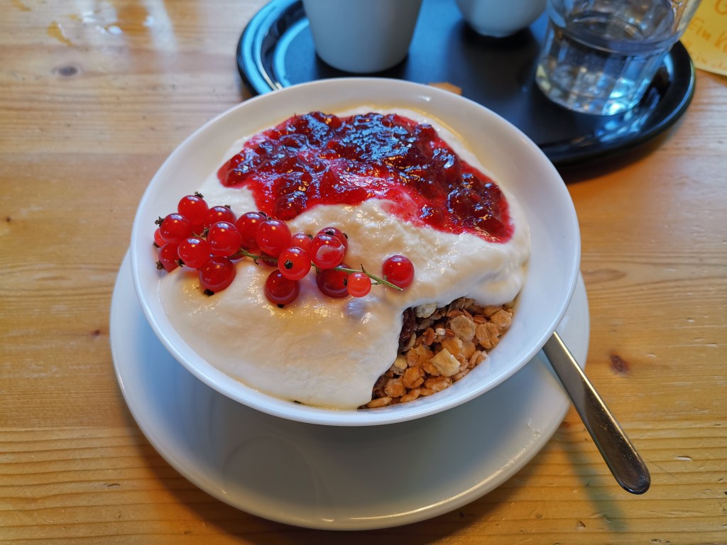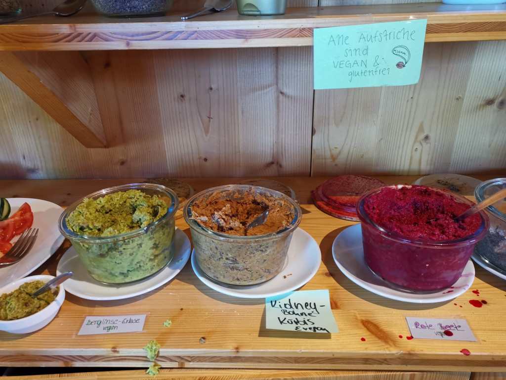 In der Früh erwartete uns dann ein hervorragendes veganes Frühstück. Man kann zwischen einem Buffet (in der Halbpension inkludiert) und einem kleinen Frühstück bestehend aus Müsli oder Brot und Heißgetränk wählen. Das Frühstücksbuffet umfasst u.a. ausgezeichnete selbstgemachte Aufstriche, Brot, Marmelade, Haferflocken, Sojamilch, Sojajogurt u.v.m.