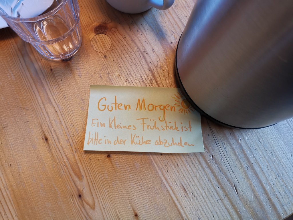 Da es bereits fast halb 7 war, nahm Hüttenwirt Tom, so der Name des freundlichen Begrüßers, noch schnell unsere Essenswünsche auf und gab sie der Küche weiter und dann saßen wir auch schon an dem für uns vorgesehenen Tisch und wurden von Küchenchefin Evelyn mit veganen Köstlichkeiten verwöhnt. (Ja, es gibt hier eine Tischordnung – da freut sich mein innerer Monk. :D)